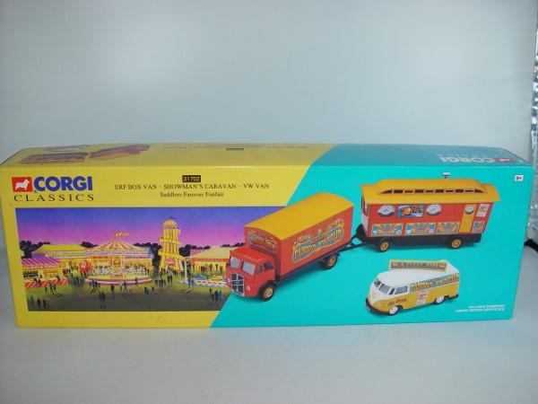 Corgi Classics - ERF Box Van - Showman's Caravan -VW Van - Saddler Famous FunFair 1:50 Nr. 31702 In originele doos met certificaat